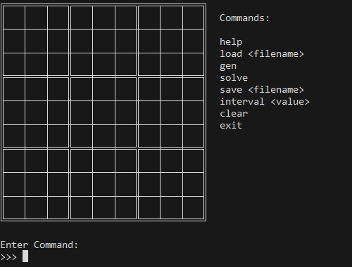 The user uses commands to interact with the program to load, save, solve or generate sudoku. Here is a representation of how that works: